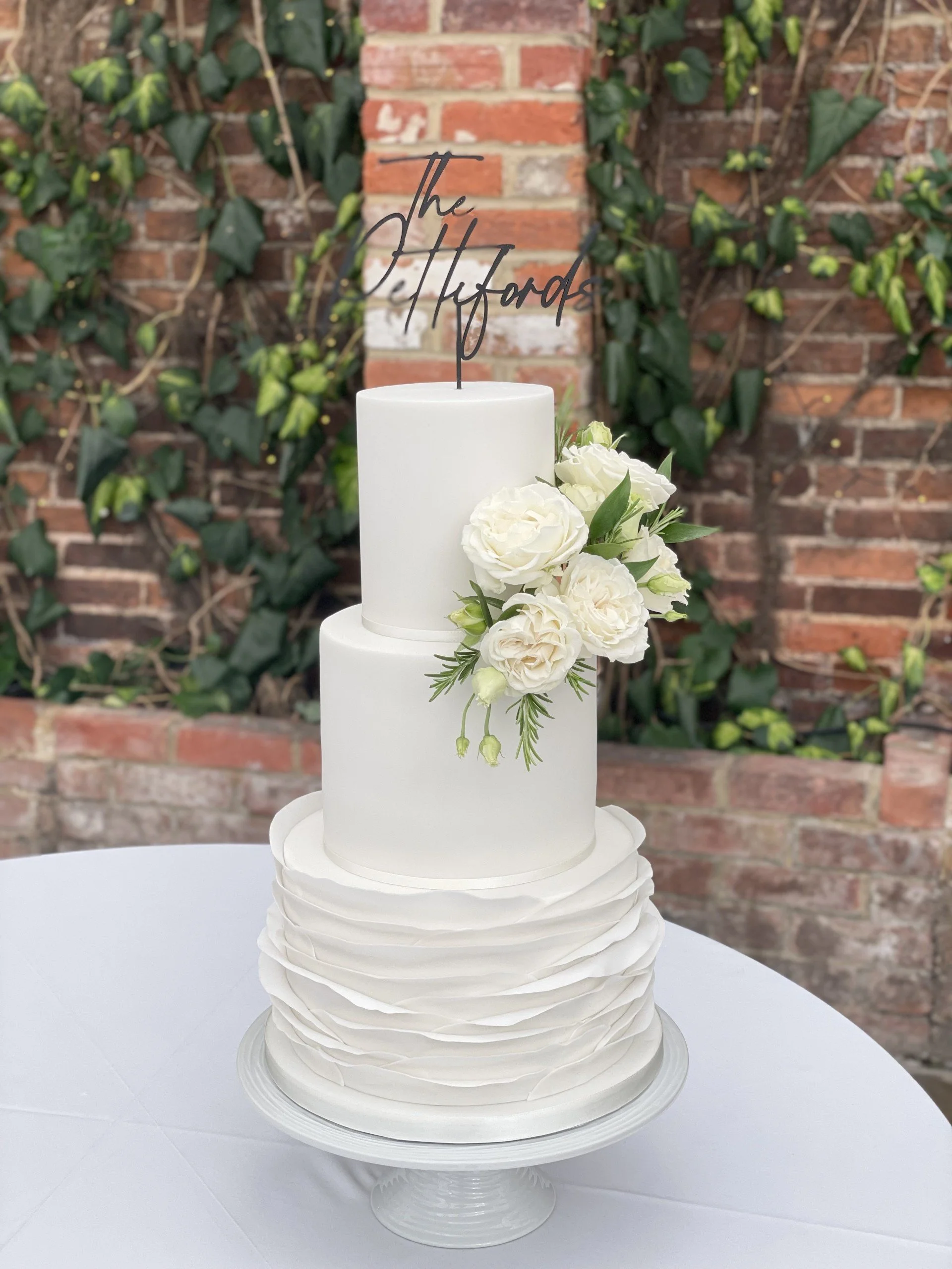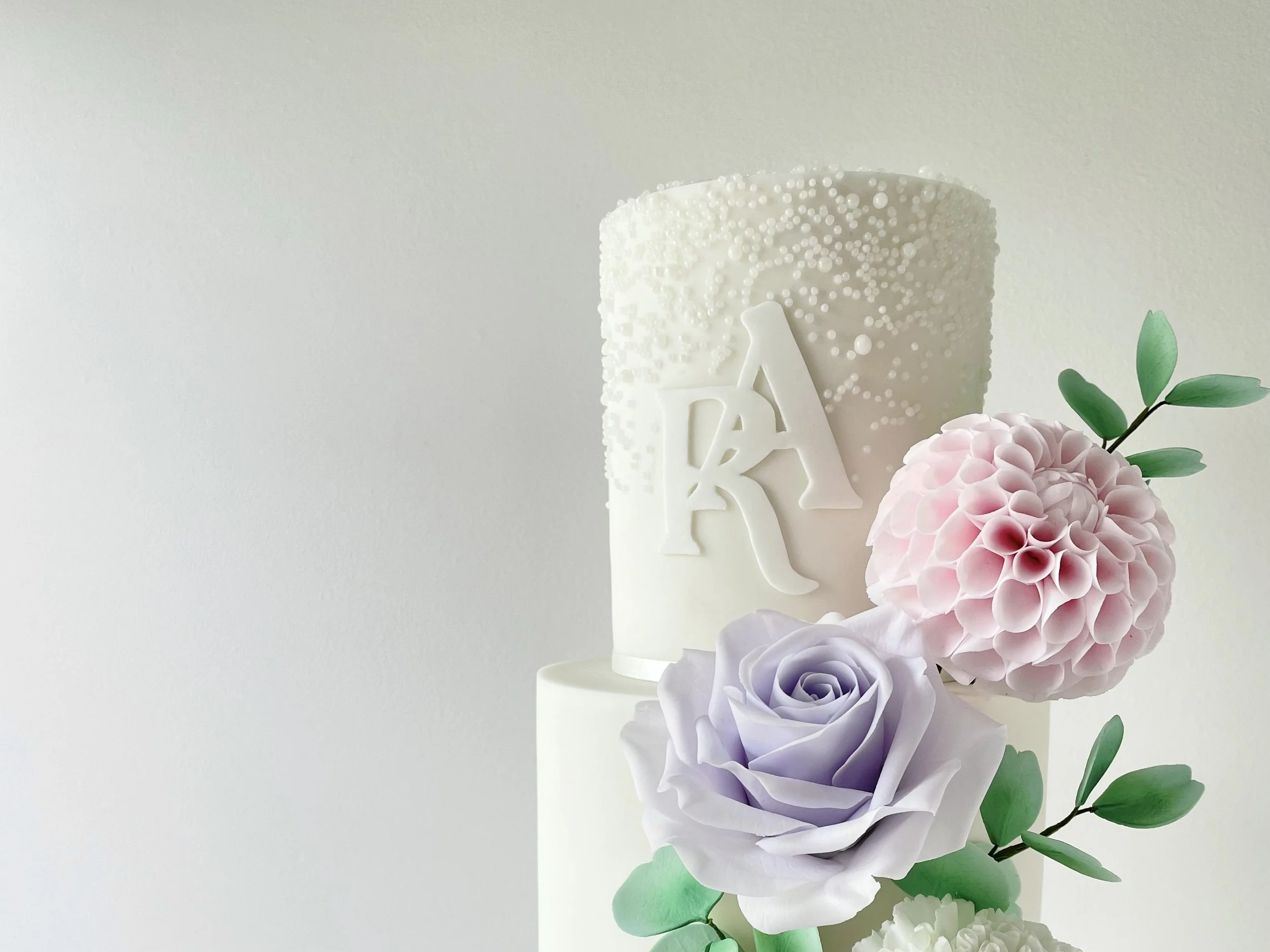 Incorporating initials in sugar on the front of the cake, in a font matching your stationery, can feel far more cohesive than placing a separate topper on the top, particularly for elegant, design-led cakes.