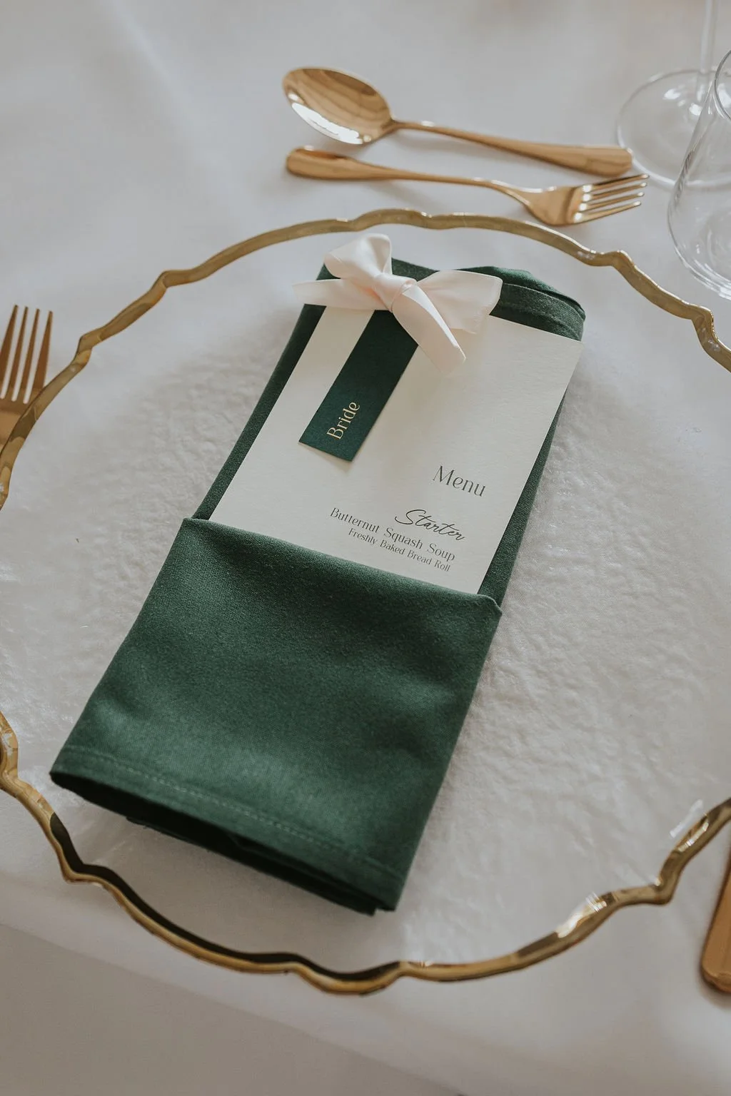 Gold details ran throughout the styling, adding warmth. From gold-edged charger plates and gold cutlery to a velvet-backed emerald "Order of the Day" sign, every detail felt considered, romantic and effortlessly luxurious.