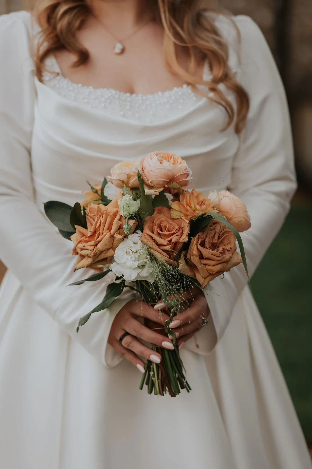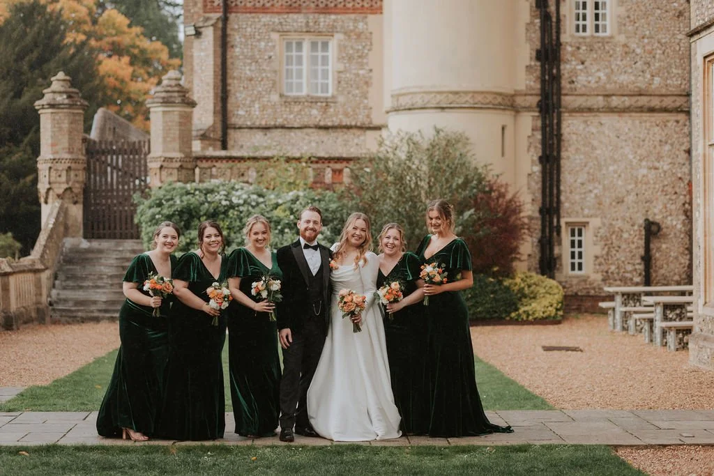 Kathryn and James's black-tie wedding embraced the season's richness. Emerald-green bridesmaid dresses alongside soft autumn tones: Apricot, ivory, deep coral, and touches of burnt orange.