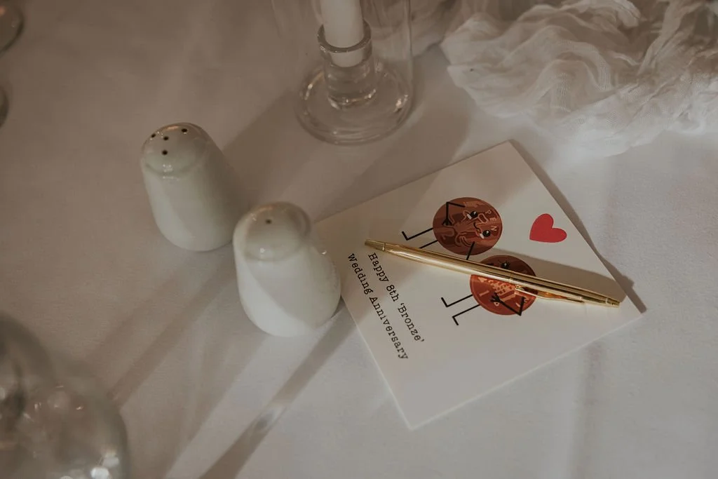 Guests found anniversary cards at their table settings, ready to sign and for the couple to open in future years, a beautiful way to extend the celebration beyond the wedding day itself.