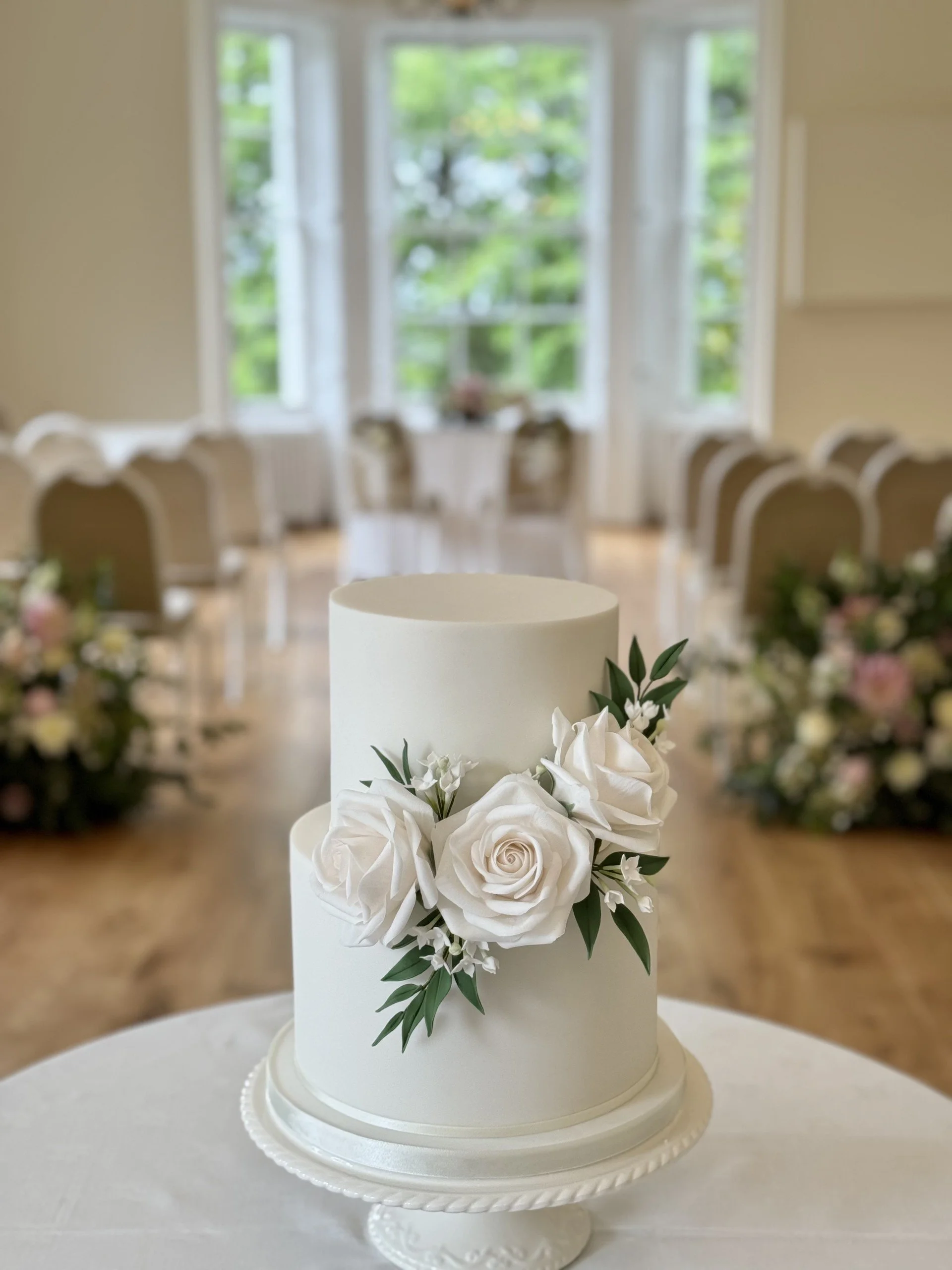 I arrange the safe delivery and setup of your wedding cake directly with your venue. For weddings held at one location, I usually arrive 2–3 hours before the ceremony. This allows plenty of time to carefully set up your cake, complete the handover with the venue team, and take a few photographs before your guests begin to arrive.
